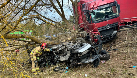 (czytaj więcej)Wypadek z udziałem trzech ciężarówek. Jedna osoba ranna