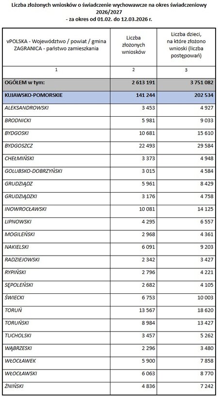 Rodzice i opiekunowie #od 1 lutego mogą składać wnioski o świadczenie wychowawcze 800 plus na nowy okres świadczeniowy. Do ZUS-u w województwie kujawsko-pomorskim wpłynęło już ponad 141 tys. wniosków obejmujących ok. 202,5 tys. dzieci. W całym kraju złożono 2,6 mln wniosków na 3,7 mln dzieci.