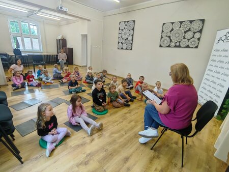 Dzieci z zainteresowaniem wysłuchały kilku krótkich opowiadań z książki „Przedszkolaki z ulicy Morelowej” autorstwa Barbary Gawryluk. Historie o codziennych przygodach przedszkolaków wywołały wiele żywych reakcji – dzieci z łatwością utożsamiały się z bohaterami opowiadań. Wybór tej właśnie książki nawiązuje do Ogólnopolskiego Dnia Przedszkolaka, które przypada 20 września.
