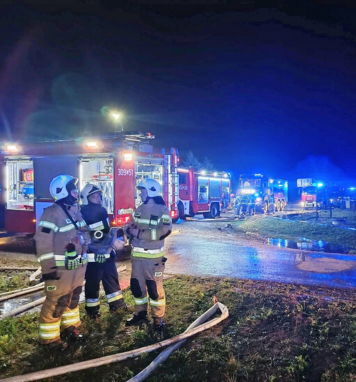 Strażacy rozpoczęli działania gaśnicze zarówno z ziemi, jak i z podnośnika, z którego podawano wodę bezpośrednio na płonący dach. Jak widać na zdjęciu, ogień najbardziej uszkodził część poddasza, jednak dzięki szybkiej interwencji udało się zapobiec jego rozprzestrzenieniu na całą konstrukcję budynku.
