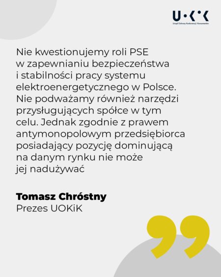 - Nie kwestionujemy roli PSE w zapewnianiu bezpieczeństwa i stabilności pracy systemu elektroenergetycznego w Polsce ani nie podważamy narzędzi przysługujących w tym celu operatorowi systemu przesyłowego. Sprawdzamy, czy instrument w postaci mechanizmu redysponowania stosowany był w transparentny i niedyskryminacyjny sposób – mówi Prezes UOKiK Tomasz Chróstny.przedsiębiorców.