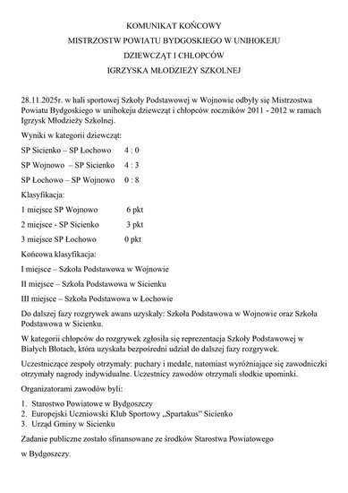 28 listopada 2025 r. w hali Szkoły Podstawowej w Wojnowie odbyły się Mistrzostwa #Powiatu Bydgoskiego w unihokeju dziewcząt i chłopców w ramach Igrzysk Dzieci oraz Igrzysk Młodzieży Szkolnej.