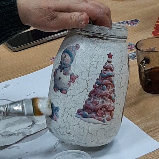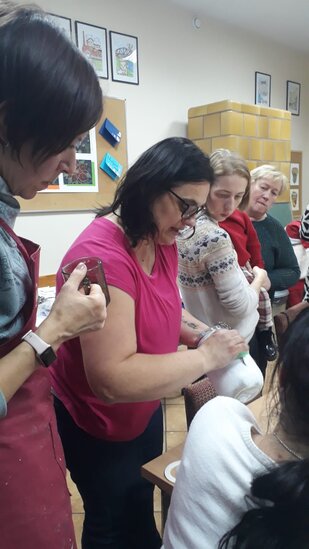 Podczas spotkania powstały różnorodne słoje z ozdobnymi pokrywkami do przechowywania pierniczków, przygotowane techniką decoupage. Był to czas pełen żartów, sąsiedzkich rozmów oraz rodzinnej bliskości.