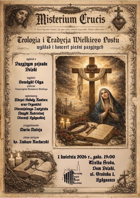 1 kwietnia 2026 r. (Wielka Środa)#, godz. 19:00, Diecezjalny Instytut Muzyki Kościelnej w Bydgoszczy z radością zaprasza na wyjątkowe wydarzenie wielkopostne „Misterium Crucis”. „Ecce lignum Crucis, in quo salus mundi pependit: Venite adoremus” - Wieczór poświęcony teologii i tradycji Wielkiego Postu, łączący wykład oraz koncert pieśni pasyjnych.