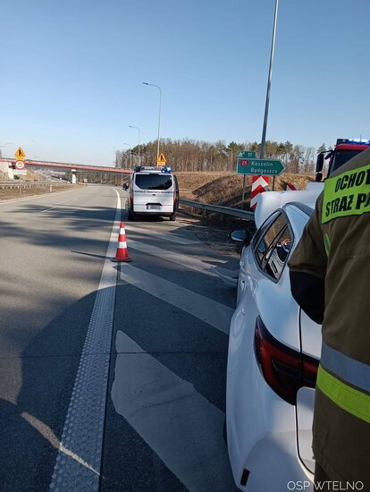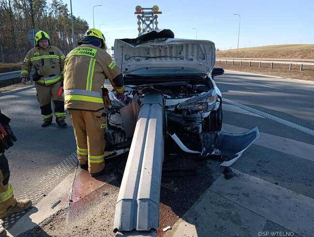 Do działań skierowano zastęp strażaków z OSP Wtelno, którzy wspólnie z JRG nr 3 w Bydgoszczy udali się na miejsce zgłoszenia. Po przybyciu potwierdzono, że samochód osobowy uderzył w bariery energochłonne znajdujące się przy drodze.