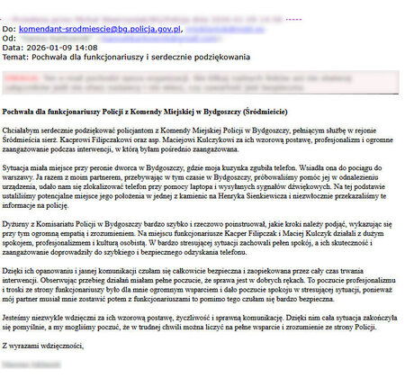 Kilka dni temu na skrzynkę mailową Komendanta Komisariatu Policji Bydgoszcz-Śródmieście, gdzie służą interweniujący policjanci - starszy posterunkowy Kacper Filipczak oraz posterunkowy Maciej Kulczyk - wpłynęły od zgłaszającej podziękowania.