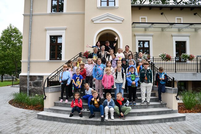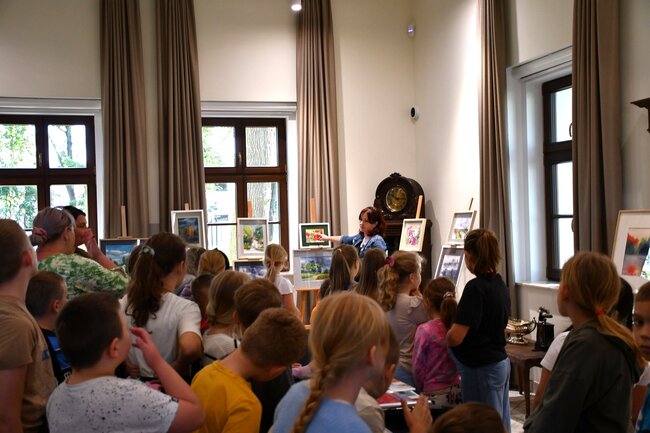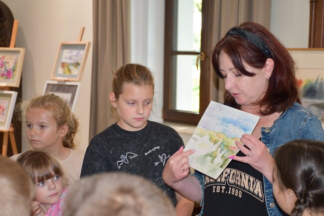 Jako pierwsi w dniu wczorajszym uczniowie Szkoły Podstawowej im. KEN w Strzelewie mogli wziąć udział w zwiedzaniu wystawy w Pałacu ale też żywej lekcji plastyki - pokazie malarstwa akwareli. Pani Dorota Popowicz-Majewska i Pan Tomasz Majewski zdradzili kilka sekretów malarstwa farbami wodnymi i pastelami. Na oczach dzieci powstał obrazek z krajobrazem. Dziękujemy ślicznie jeszcze raz, za ta to wspólne spotkanie.
