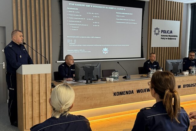 Na koniec Zastępca Komendanta Wojewódzkiego Policji w Bydgoszczy inspektor Jacek Witas podziękował za osiągnięte w 2025 roku wyniki oraz omówił założenia i priorytety na kolejny, pracowity rok, życząc wszystkim funkcjonariuszom wytrwałości i dalszych sukcesów.