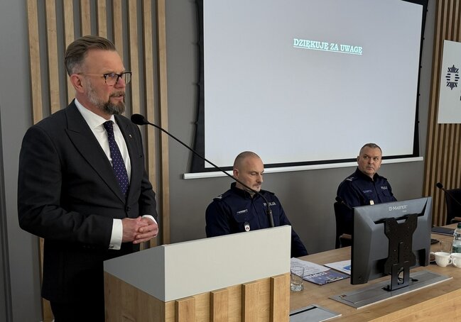 Następnie Komendant Miejski Policji w Bydgoszczy młodszy inspektor Mariusz Gaik przedstawił sprawozdanie z działalności jednostki w 2025 roku, omawiając między innymi stan kadrowy, kwestie dyscypliny służbowej, działania promujące zawód policjanta oraz przedsięwzięcia mające na celu poprawę bezpieczeństwa publicznego.