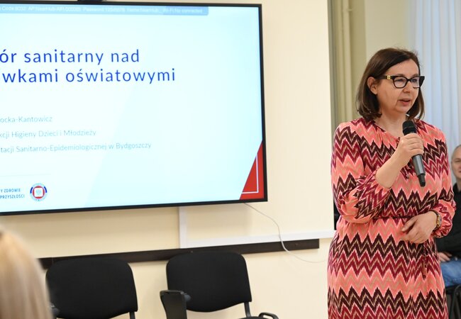 • Nadzór sanitarny w placówkach oświatowych – temat omówiła Justyna Przygocka-Kantowicz – Kierownik Sekcji Dzieci i Młodzieży. Przedstawiła obowiązki szkół w zakresie zapewnienia bezpiecznych i higienicznych warunków nauki, najczęstsze zalecenia pokontrolne oraz obszary wymagające stałego monitorowania.