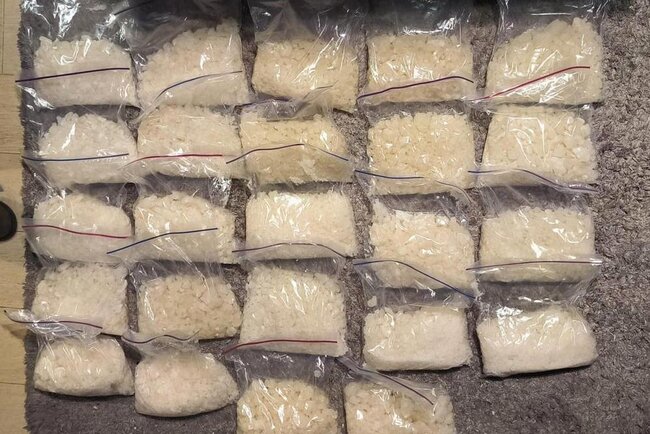Łącznie zabezpieczono blisko 50 kg kryształu, prawie 25 kg zielonego suszu roślinnego, grzyby halucynogenne, kilka gramów białego proszku, 21 tabliczek czekolady z najprawdopodobniej grzybami halucynogennymi. W mieszkaniu znajdowało się także kilkaset opakowań e-papierosów bez polskich znaków akcyzy, waga elektroniczna, folia do zgrzewania oraz znaczna ilość gotówki.